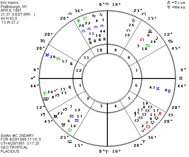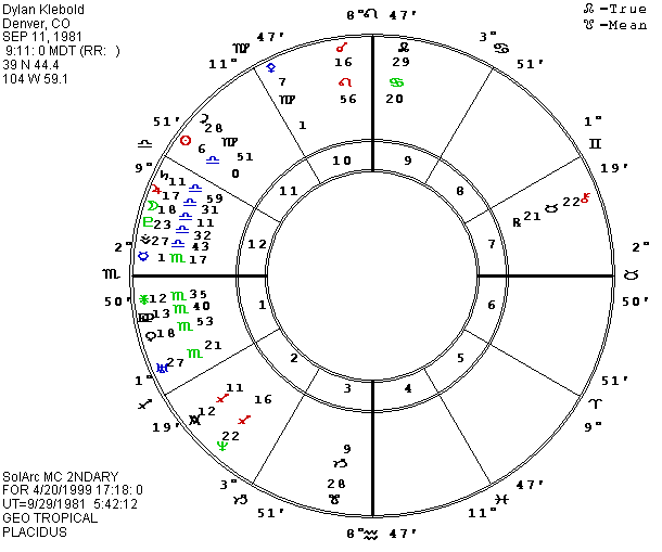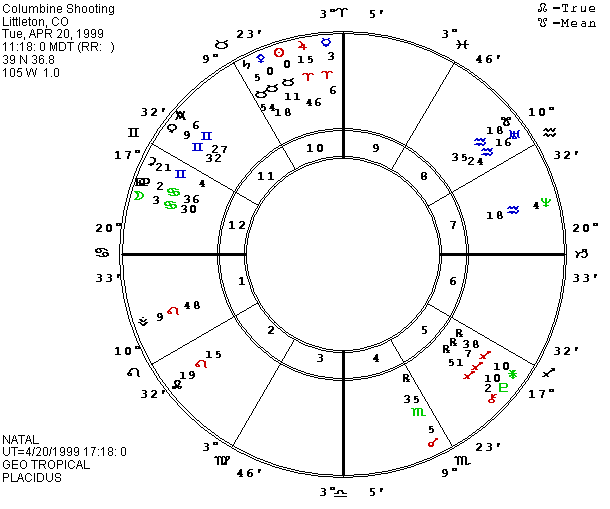 People in the U.S. and in many other areas have been fixated in recent weeks on scenes of violence; the genocide underway in Kosovo and the massacre in Colorado by two high school students. The Internet has helped some families to find loved ones driven from their homes by the Serbs, though standard TV news channels have provided the graphic pictures. For astrologers, the Internet has helped to share data. Within days after the violence in the Columbine high school in Littleton, CO, the birth data of the two “presumed” killers was circulating on the “net.” Storm Castavani wrote that he went to Plattsburgh, NY and was able to obtain the birth certificate of Eric Harris. Debra Spaulding claimed that she was able to see the birth certificate of Dylan Klebold in Denver, CO.