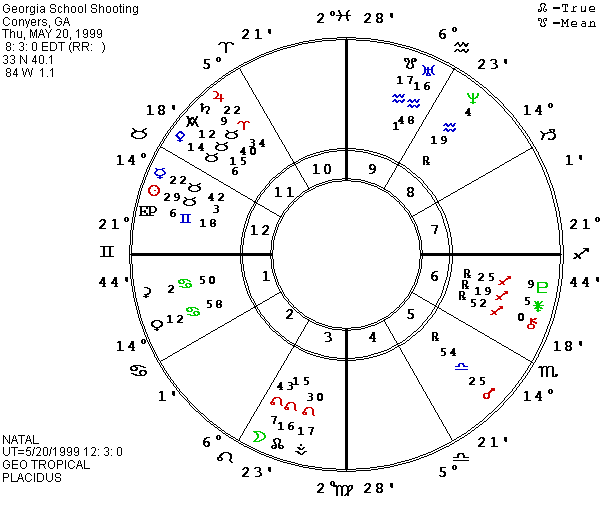 As this article was being edited to describe the uncertainty over Dylan’s birth time, a new school shooting occurred in Conyers, GA. The 15-year-old sophomore in Heritage high school, T. J. Solomon, had a rifle and a handgun which belonged to his parents. He broke into a locked basement cabinet to get them and carried them to school on the school bus. He was initially described as a very quiet individual, a Boy Scout who had never been in any trouble. For the commentators who see religion as a cure-all for youth violence, he also attended church regularly. However, later information revealed that he had talked to friends about shooting people, and a month before the shooting incident he brought a gun to school. A fellow student reported the gun to the office, but the suspect had left the school for the day and the next day he did not bring a gun. Six students were wounded in the incident, fortunately none critically, as the suspect fired low and randomly rather than aiming at anyone. The incident occurred at 8:03 A.M. EDT on May 20, 1999, just one month after Littleton. Fellow students identified the shooter as T.J. Solomon and he was quickly taken into custody. There are lots of astrologers in nearby Atlanta, so we may get his birth data in time.