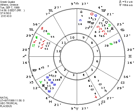 The usual asteroids were featured. The Greeks associated earthquakes with Poseidon, called Neptune by the Romans. Poseidon was conjunct Aeternitas, immortality, and both squared the Ascendant from 19 Virgo and were trioctile Jupiter. The Ascendant was also quincunx Libitina, the Roman goddess of death, in 19 Cancer. Libitina also squared Hel, a Norse death goddess, which was in 19 Libra. Pallas was conjunct Atlantis, with both square the MC from 9 to10 Cancer. Karma in 4 Cancer squared Vesta and was octile Venus. Atropos, another death goddess, was in 0 Libra, octile Hestia in 15 Leo and the Ascendant/MC midpoint in 14 Scorpio. Hestia was the Greek name for Vesta. The East Point was octile Gaea, the earth, in 22 Scorpio 51. Richter, the scale which measures quake magnitudes, was in 27 Cancer, octile Pythia, the title of the priestesses of Delphi, the famous, ancient Greek shrine. Pythia’s square to Mercury connected it to Richter with an overlapping orb. There was no modern Pythia to give advance warning of the quake. More asteroids could be mentioned, but we will end with Athene, the patron goddess of the city of Athens. She was in 10 Leo, on the mean north lunar node, opposite the south node.